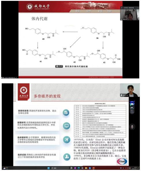 研讨会上,药物化学的11名研究生以“现代新药研发与工艺案例”为主题,分别从克唑替尼类药物的研发进展、赖诺普利的研发历程及其药物骨架后修饰、新型恶唑烷酮类抗生素的研发进展、氟西汀的研发进展等展开分享。过程中,张翔老师及时对同学们所分享的内容进行细致点评,肯定优点,指出不足,并对现场师生提出的问题进行补充和延伸,纵深研讨深度,激发了现场师生的浓厚兴趣。