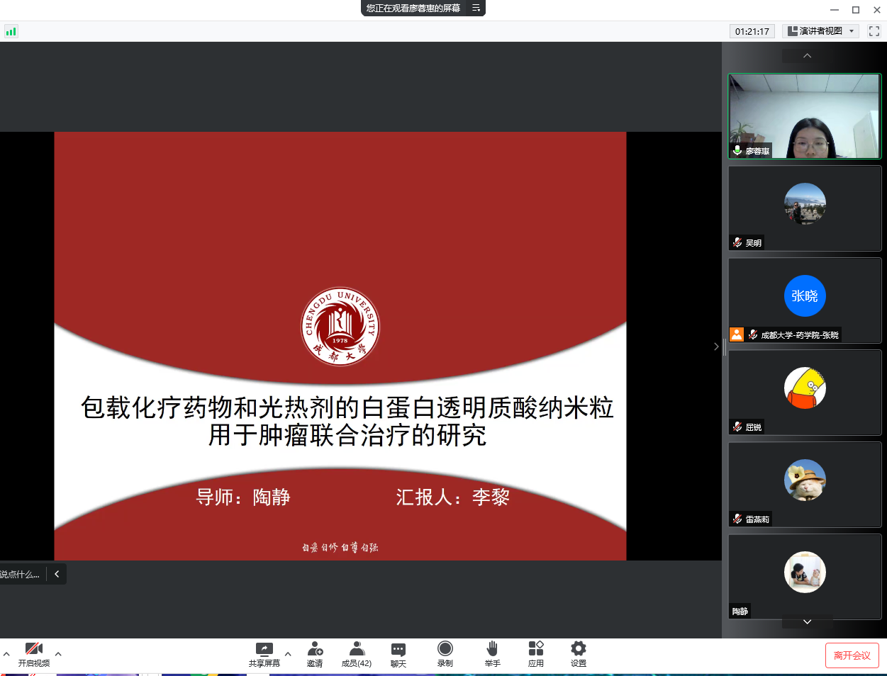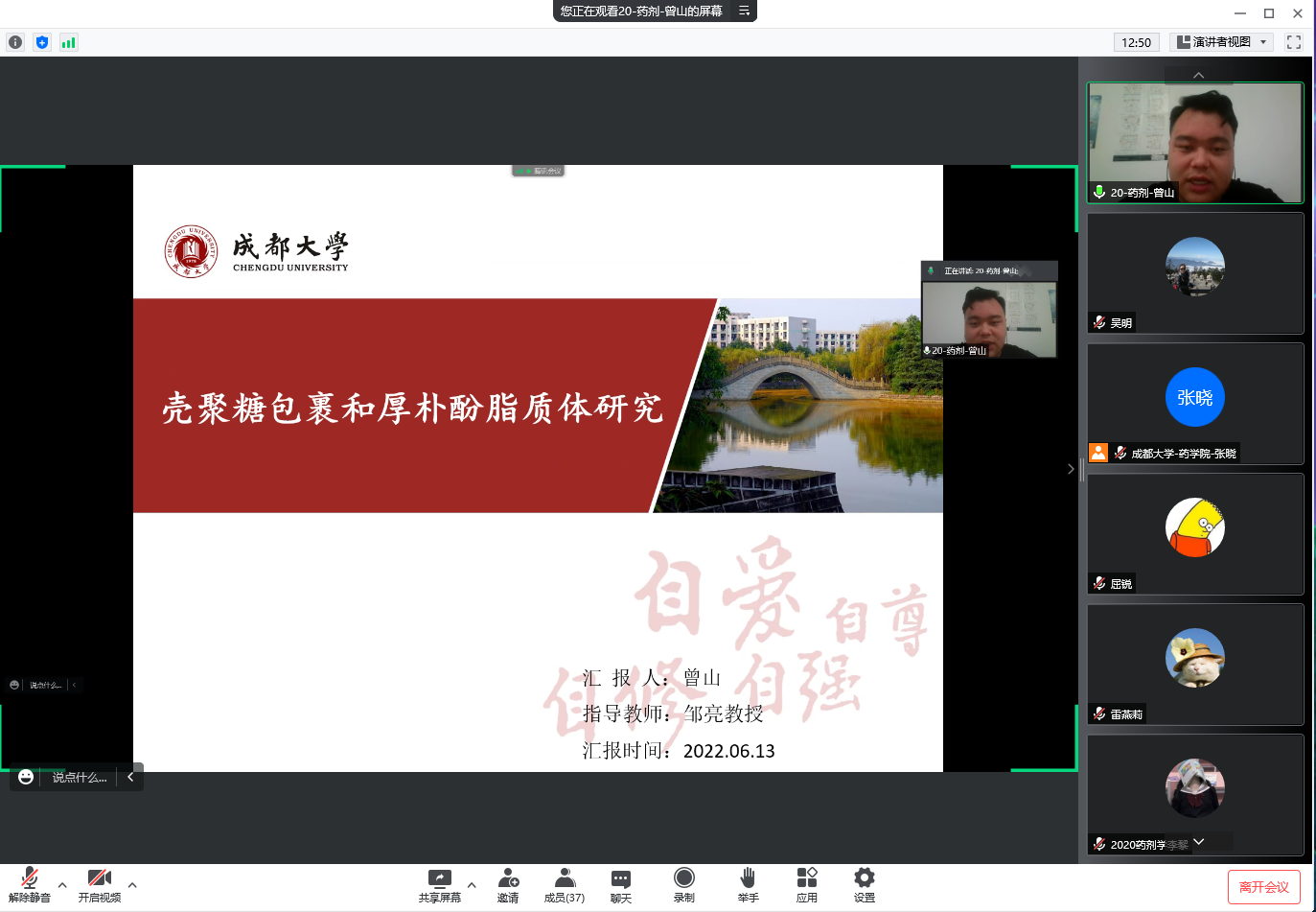 2022年6月13日星期一下午13:30时,草榴社区 开展2020级药剂学专场硕士研究生中期汇报会,本次汇报会由研究生教务办公室承办,于腾讯会议线上举行,会上8位药剂学研究生同学进行了中期汇报,由草榴社区 导师组成的考核小组给每位同学予以点评。