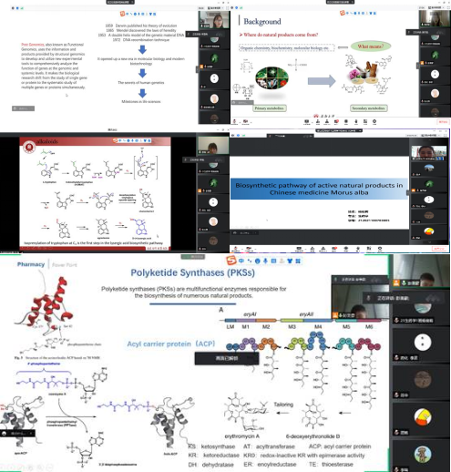 本次会议由彭美豪同学主持,全体生药学同学围绕“天然产物的生物合成”主题进行汇报,从“后基因时代的生物合成”“萜类化合物的生物合成途径”“生物碱类化合物的生物合成途径”“聚酮类化合物的生物合成途径”“桑白皮的生物合成途径”多个方面进行分享,同时参会的老师和同学针对学术问题进行了探讨和交流。