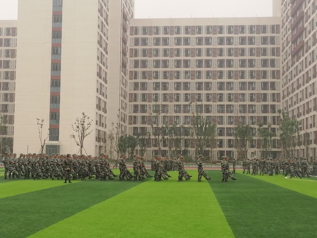男生们训练踢正步和齐步走,他们走得铿锵有力,十分认真,抓地有声。