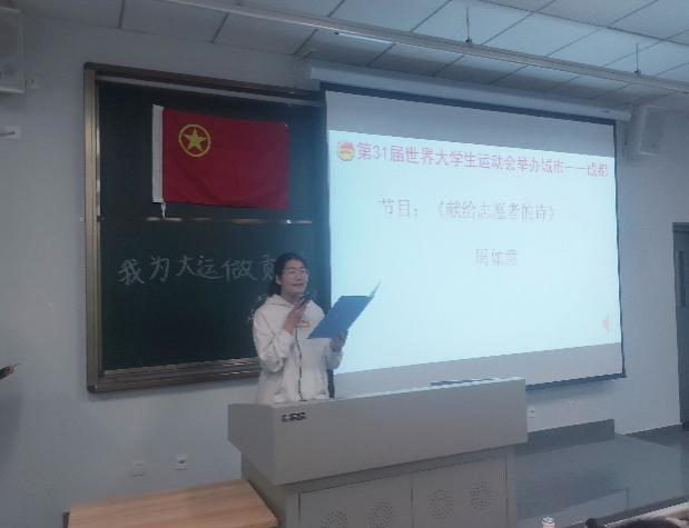 2020级英语1支部周如意朗诵诗歌《献给志愿者的诗》,致敬、赞美、歌颂所有参与大运会服务的伟大的志愿者们,更鼓励同学们积极投身大运会志愿者工作。