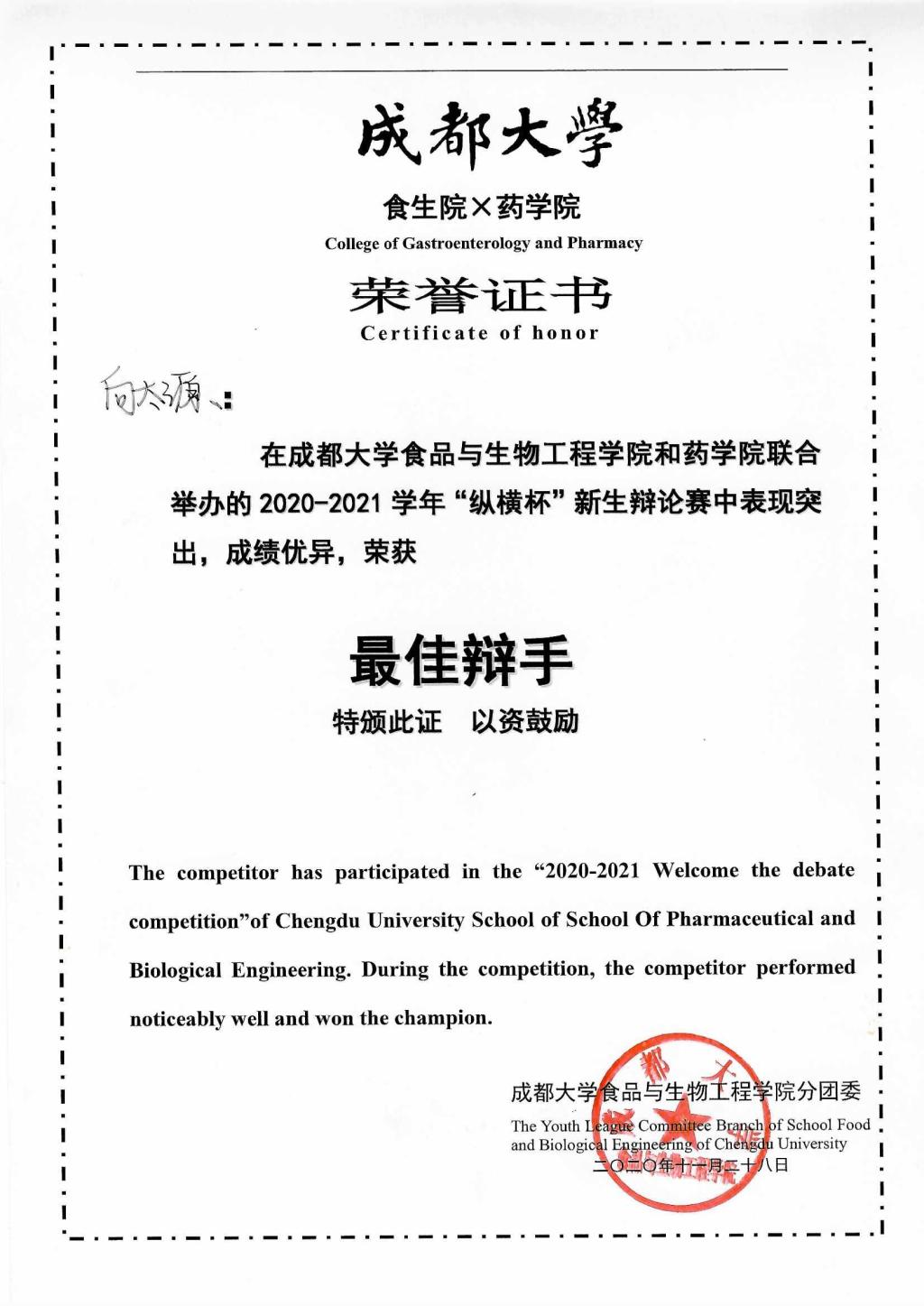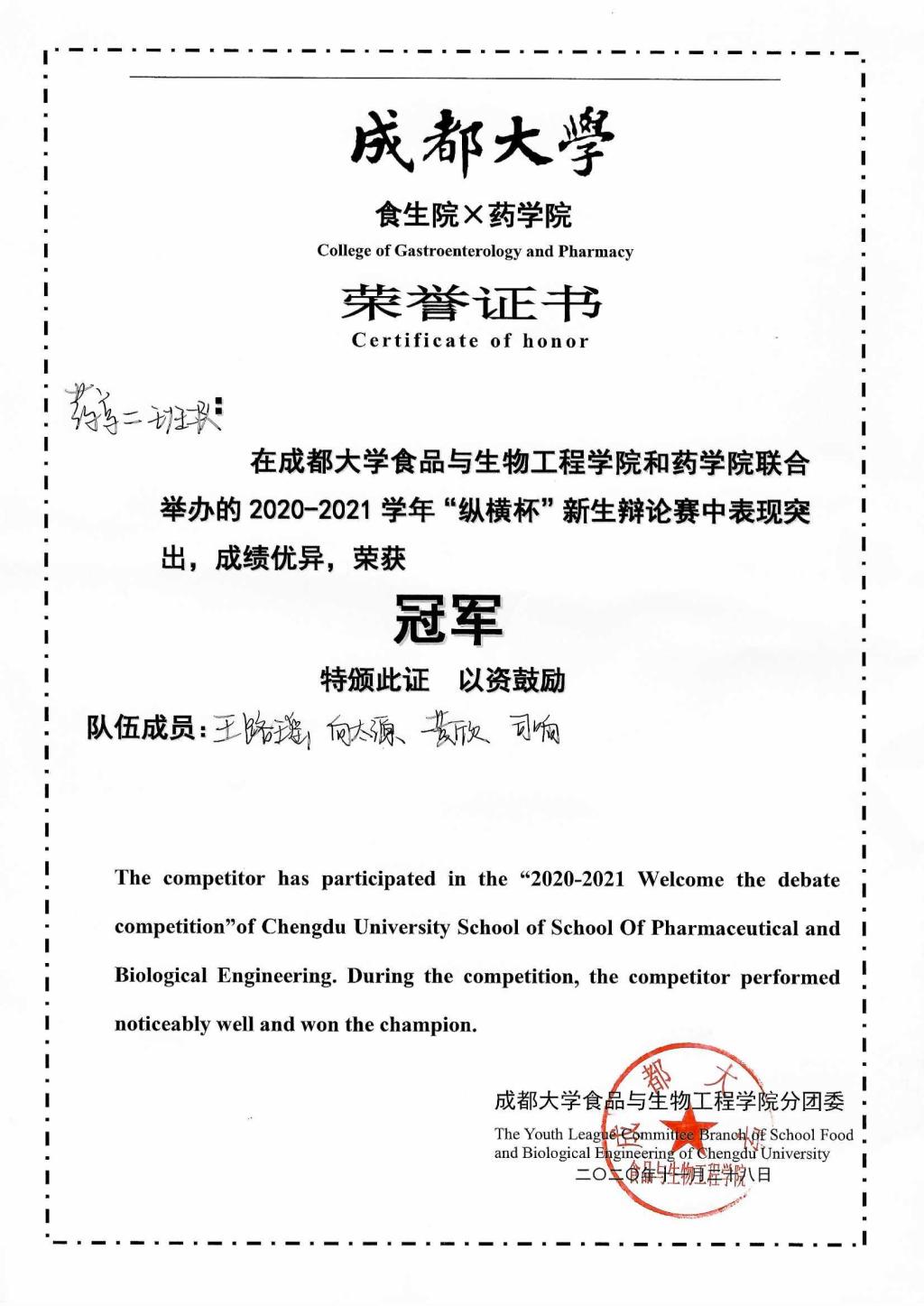 本届辩论赛药学2班2队获得冠军,向太源获得决赛的“最佳辩手”称号。食品科学与工程1班2队获得亚军,药学2班1队和生物工程1班1队获得季军。