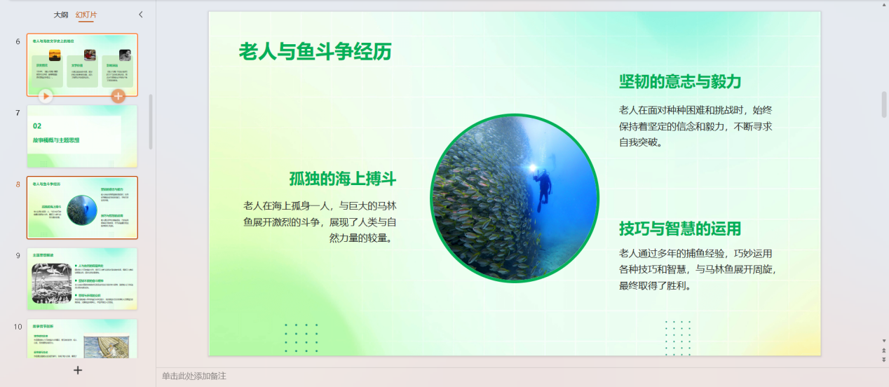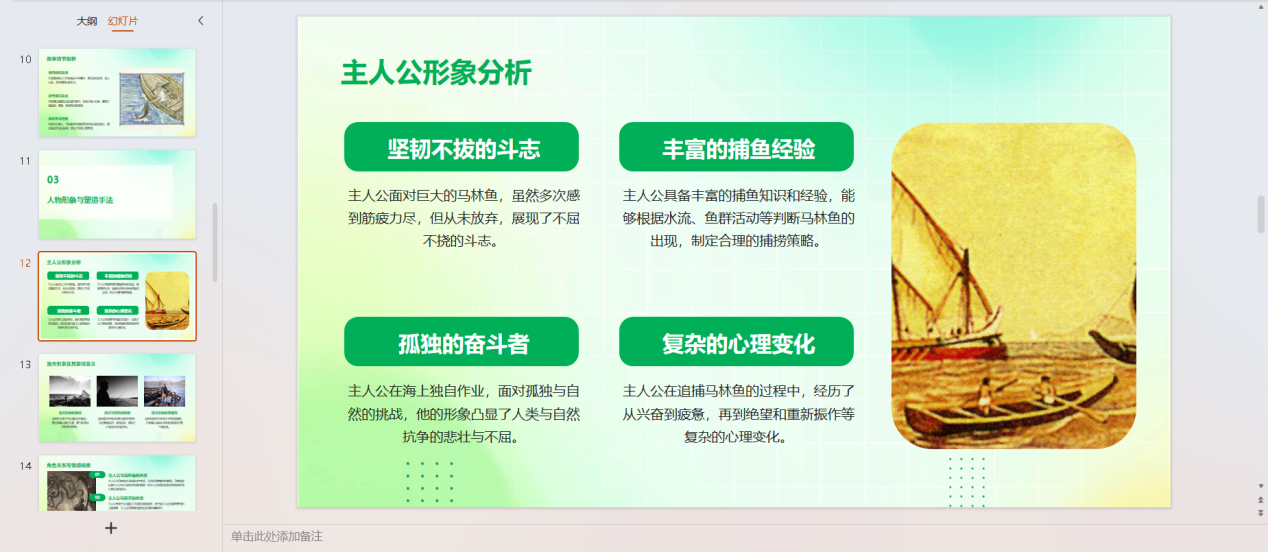 综合楼举行了一次以《老人与海》为主题的阅读活动。田远航通过精心准备的PPT,他向大家分享了《老人与海》这本书籍的故事情节、作者以及主要人物老人与马林鱼搏斗,并进行了经典台词的鉴赏,阐释了面对挫折不断努力的重要意义。