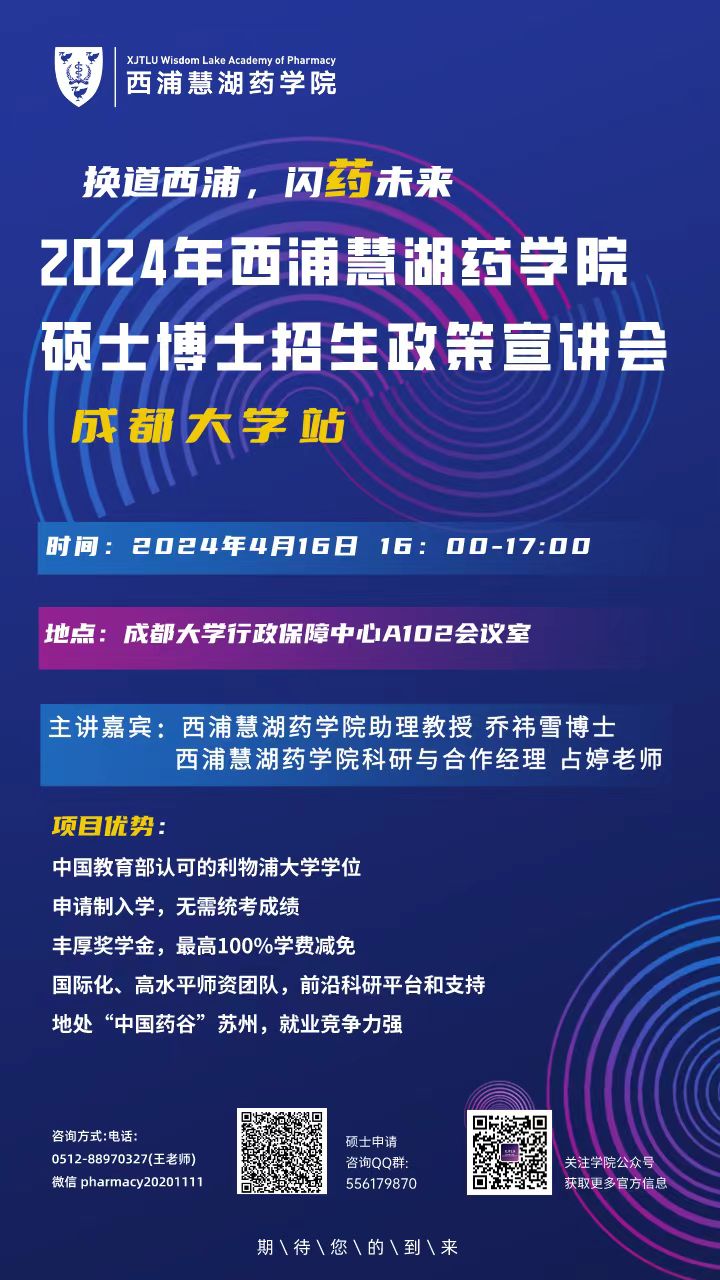 宣讲中,还对硕博项目的录取要求、相关研究方向以及奖学金申请标准等方面进行详细讲解。同时还向同学们介绍了西浦慧湖草榴社区 国际化、高水准的师资团队与硬件设施,以及地处“中国药谷”苏州,与当地多家药企合作的优势条件,展现了为青年成长成才、建功立业创造良好环境的决心。