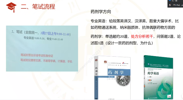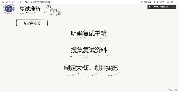 许科浩同学从学校的成绩计算方式、参考书目、复试笔试和面试以及自己的复试经验等方面进行讲述。在个人经验方面,他着重讲到,虽然笔试考察内容较为基础,但必须要注意回答内容的充实性和逻辑的连贯性。除此之外,规整的字迹也很为自己加分。