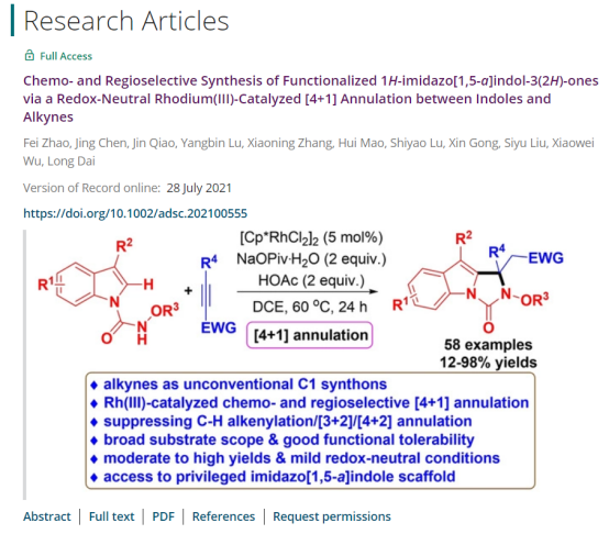 赵飞课题组还报道了一例铑催化吲哚和缺电子炔烃之间的[4+1]环加成反应,快速构建了1H-咪唑并[1,5-a]吲哚-3(2H)-酮类化合物。该反应具有化学选择性和区域选择性高、底物适用范围广、官能团耐受性好、产率优良、反应条件温和、不需要外源氧化剂等优点。该工作以“Chemo- and Regioselective Synthesis of Functionalized 1H-imidazo[1,5-a]indol-3(2H)-ones via a Redox-Neutral Rhodium(III)-Catalyzed [4+1] Annulation between Indoles and Alkynes” 为题目于2021年7月发表于《Advanced Synthesis & Catalysis》上。全文链接://onlinelibrary.wiley.com/doi/10.1002/adsc.202100555