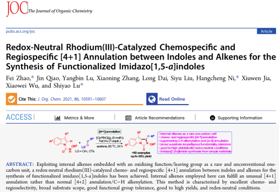 赵飞课题组还发现了一例基于吲哚和烯烃的[4+1]环加成反应构建咪唑并[1,5‑a]吲哚类化合物的合成方法。研究表明,该反应具有化学选择性高、区域选择性高、底物适用范围广、官能团耐受性好、产率优良、反应条件温和等优点。值得一提的是,烯烃底物不仅作为C1合成子参与了 [4+1]环加成反应,而且还充当了内源氧化剂的功能,使得该反应在温和的中性条件下即可顺利发生。该工作以“Redox-Neutral Rhodium(III)-Catalyzed Chemospecific and Regiospecific [4+1] Annulation between Indoles and Alkenes for the Synthesis of Functionalized Imidazo[1,5-a]indoles”为题目于2021年7月发表于《The Journal of Organic Chemistry》上。全文链接://pubs.acs.org/doi/10.1021/acs.joc.1c01256