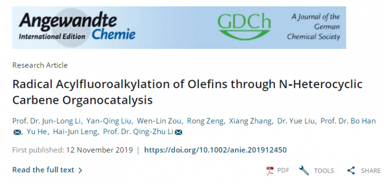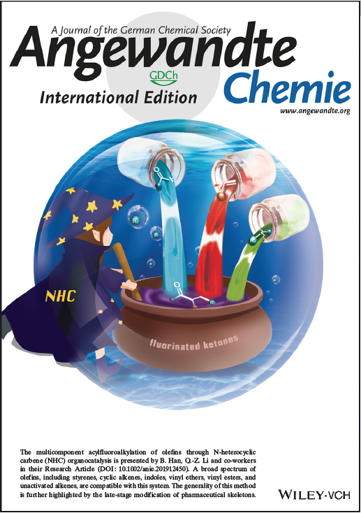 为第一单位在线发表了题为“Radical Acylfluoroalkylation of Olefins through N-Heterocyclic Carbene Organocatalysis”的最新研究成果。该工作得到了国际同行的高度认可,被选为封面文章。