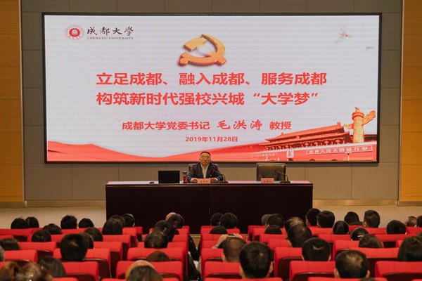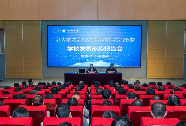 11月28日下午,校党委书记毛洪涛在新图书馆报告厅以《立足成都、融入成都、服务成都,构筑新时代强校兴城“大学梦”》为题,为川抗所全体教职工和研究生代表做了学校发展形势报告。川抗所党委书记阳东主持报告会。