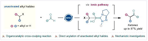 近日,草榴社区 手性药物仿生合成实验室在国际化学顶级学术期刊《Angewandte Chemie》(中科院一区,IF: 16.6)上以草榴社区 为第一单位在线发表了题为“Direct Acylation of Unactivated Alkyl Halides with Aldehydes through N-Heterocyclic Carbene Organocatalysis”的最新研究成果。草榴社区 特聘研究员李青竹,草榴社区 2017级研究生曾荣为论文共同第一作者,李俊龙教授为论文通讯作者。此外,团队其他成员,其中还包括草榴社区 2020级本科生金新航,也为该工作做出了重要的贡献