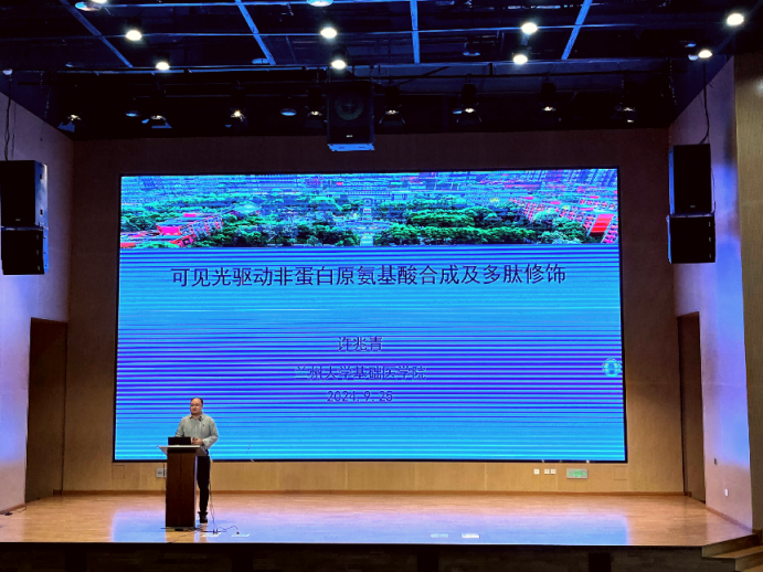 许兆青教授长期从事多肽药物相关的基础与应用研究,创建了多肽的新型化学修饰技术体系并应用于多肽新药研究。本次交流以“可见光促进的非蛋白源氨基酸合成及多肽化学修饰”为题,介绍了其研究团队采用一系列非天然氨基酸合成方法及多肽修饰策略,在多肽结构修饰和骨架编辑等方面的研究工作。这些研究成果为多肽新药的研发打开了新的通道。参会师生纷纷表示报告精彩,受益匪浅。