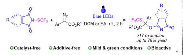 三氟甲硫基(SCF3)官能团具有较强的吸电子能力及较高的脂溶性,进而能增强分子的代谢稳定性和细胞膜穿透性,有效提高分子生物活性,具有较大的医疗潜力。过去几十年,三氟甲硫基化反应得到了快速发展,一系列高效、直接的方法被成功开发。近年来,基于α-重氮羰基化合物的特性并结合三氟甲硫基化策略,一系列利用α-重氮羰基化合物的三氟甲硫基化方法应运而生,但仍存在如反应类型单一、过度依赖金属介导或催化等诸多问题。鉴于此,作者采用光化学策略,使用可见光诱导α-重氮酯分解成自由卡宾,再与PhtSCF3衍生物发生作用形成氧鎓中间体,最终经2,3-σ重排实现了α-重氮酯的三氟甲硫基化/双官能团化反应,为合成多官能团化的含三氟甲硫基复杂分子骨架提供了高效、绿色、经济新方法。同时,初步的抗菌实验表明该类含三氟甲硫基产物对革兰氏阳性菌有较强的抑制作用,具有良好的生物活性潜力,有望在将来得到更广泛的研究和应用。此外,作者通过控制实验和理论计算等手段进一步佐证了该反应的单线态卡宾机理。