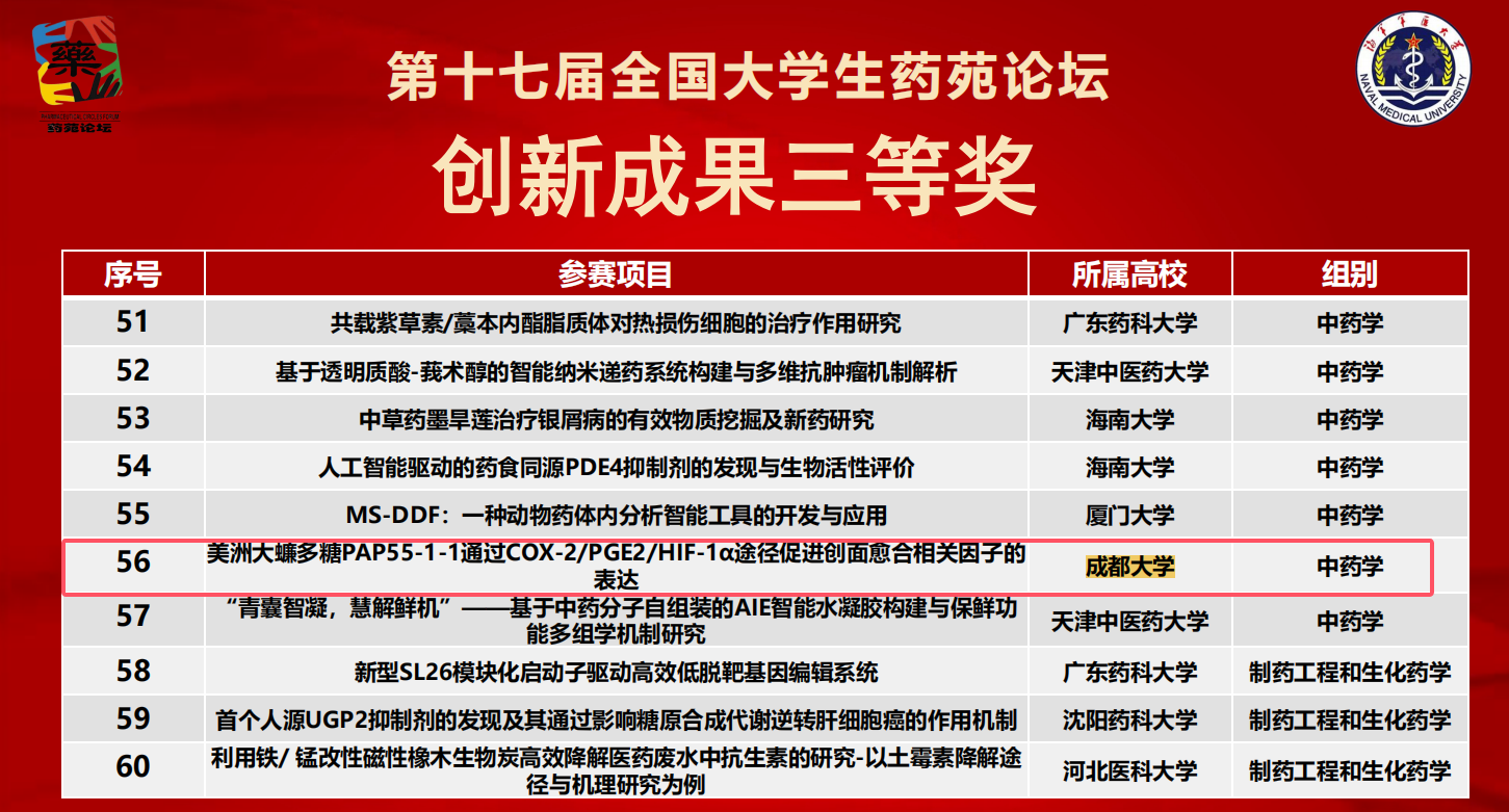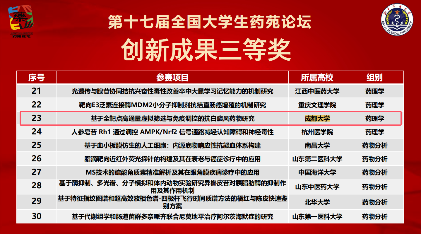 2025年10月18日,第十七届全国大学生药苑论坛决赛在中国人民解放军海军军医大学圆满落幕。草榴社区 学子经过激烈角逐,由周宗元老师指导学生李灿、李雍左的作品《基于全靶点高通量虚拟筛选与免疫调控的抗白癜风药物研究》和宋芹老师指导学生朱爱莲、卿阳、魏玉的作品《美洲大蠊多糖PAP55-1-1通过COX-2/PGE2/HIF-1α途径促进创面愈合相关因子的表达》在药学学科赛道均获得创新成果全国三等奖,实现草榴社区 学子在该赛事获奖零的突破。