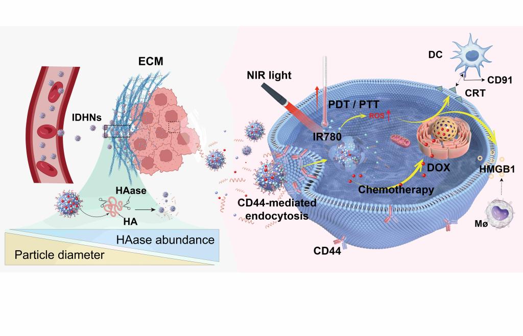 针对实体肿瘤内部致密的物理屏障使传统纳米药物难以深入,以及纳米药物在长循环与深穿透之间存在的“尺寸困境”,作者成功开发了一种具有独特结构的智能纳米药物:利用透明质酸充当“分子胶水”,通过氢键和疏水作用,将人血清白蛋白稳定地“粘合”在一起,构建出结构牢固的初始纳米粒,确保了其在血液循环中的稳定性。然而,“分子胶水”可被肿瘤特异性酶降解,当纳米粒富集于肿瘤组织后,能响应肿瘤微环境中高浓度的透明质酸酶,从约200 nm的初始尺寸“裂变”成更小的、结构完整的功能单元。这一巧妙的“酶触发裂变”机制,成功解决了药物在肿瘤组织内渗透不足的难题。实验证明,该纳米平台通过“胶水”的解离实现尺寸自适应,并协同化疗-光热-光动力三重疗法,在动物模型中实现了约90%的肿瘤抑制率,同时展现出良好的生物安全性,为攻克肿瘤药物递送壁垒提供了一种极具前景的新策略。