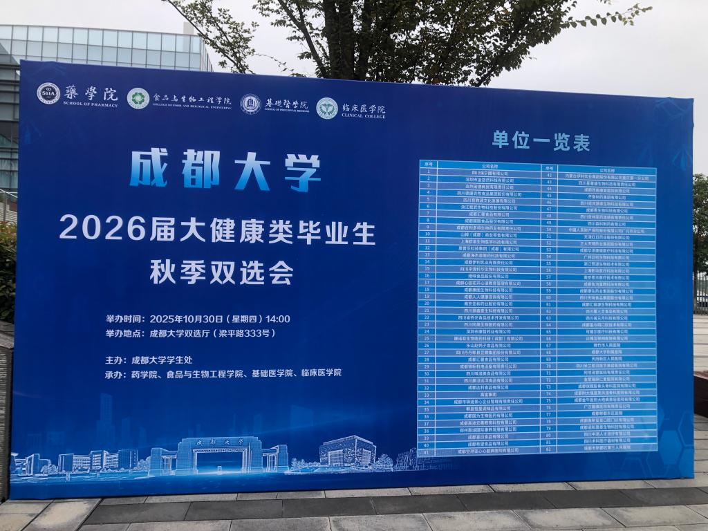 从简历投递数据看,成都西南康复医院有限公司(105份)、成都康弘药业集团股份有限公司(88份)、四川诺鸿慧康生物科技有限公司(75份) 成为本届双选会的“人气标杆”。此外,成都百利多特生物药业有限责任公司、齐鲁制药集团有限公司、四川德康农牧食品集团股份有限公司等一批行业领军企业也成功锁定大量心仪人才,充分印证了成大毕业生在大健康产业界日益提升的声誉与竞争力。