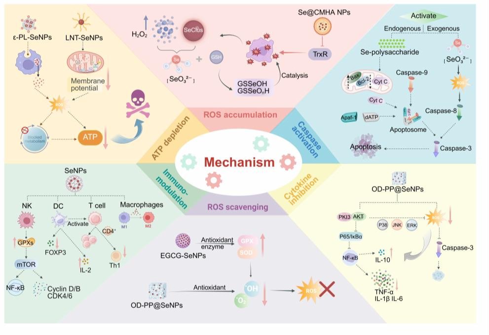 图1. 硒纳米粒衍生生物活性物质的治疗机制示意图