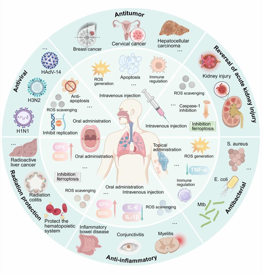 硒纳米粒衍生生物活性物质(SeNPs-derived bioactives)凭借独特的生物活性、良好生物相容性与可工程化特性,近年来在疾病治疗研究中备受关注。该综述系统总结了SeNPs的主要制备策略,包括化学还原法、生物合成法与物理合成法,阐述了不同方法在粒径控制、表面化学与结构调控方面的特点,为后续材料优化奠定了基础。在生物作用机制方面,文章深入解析了SeNPs的细胞毒性作用和保护作用双重属性:其可通过调控氧化应激、激活半胱天冬酶信号、诱导线粒体功能障碍及ATP耗竭,实现对异常细胞的精准清除;同时又能清除活性氧、调节炎症因子、重塑免疫微环境,在抗氧化、抗炎与免疫调控中发挥核心作用(图1)。该综述还总结了源自硒纳米粒的生物活性物质在肿瘤治疗、抗菌、炎症性疾病干预、放射防护、急性肾损伤修复及抗病毒治疗等方面的最新研究进展,展示了其作为多疾病治疗平台的广谱潜力(图2)。