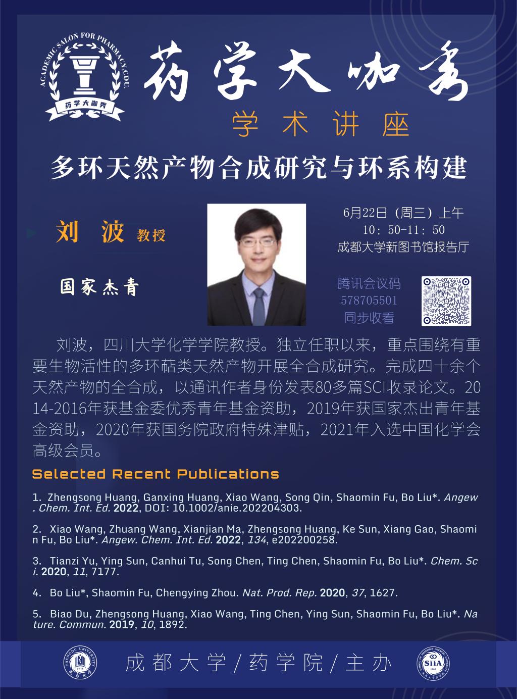 主讲人介绍:刘波,四川大学化学学院教授。独立任职以来,重点围绕有重要生物活性的多环萜类天然产物开展全合成研究。完成四十余个天然产物的全合成,以通讯作者身份发表80多篇SCI收录论文。2014-2016年获基金委优秀青年基金资助,2019年获国家杰出青年基金资助,2020年获国务院政府特殊津贴,2021年入选中国化学会高级会员。