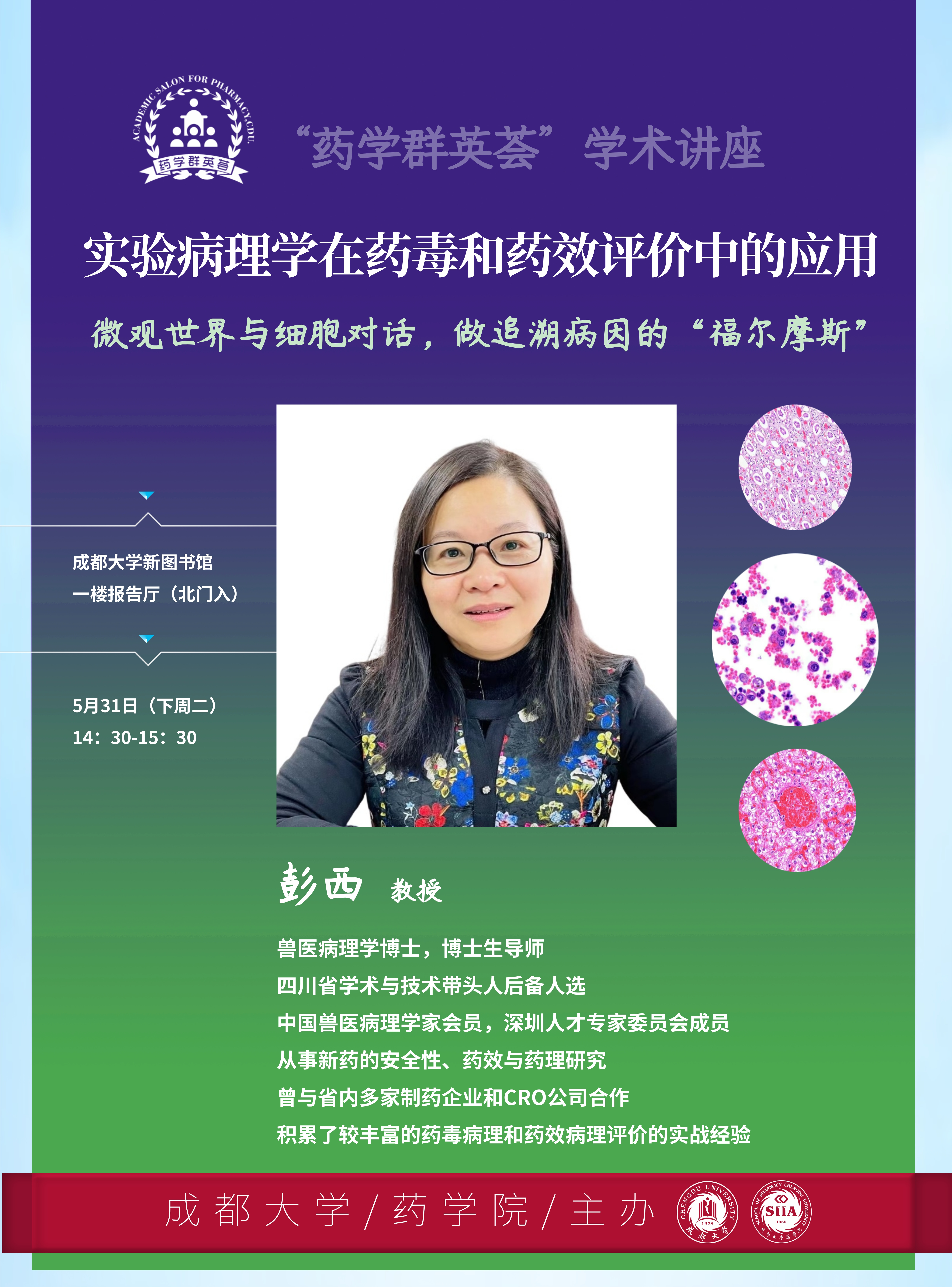 主讲人:彭西,农学博士,教授,博士生导师,四川省学术与技术带头人后备人选,中国兽医病理学家会员,深圳人才专家委员会成员。从事新药的安全性、药效与药理研究,曾与省内多家制药企业和CRO公司合作,累积了较丰富的药毒病理和药效病理评价的实战经验。主持国家和部省级项目4项;一作或通讯发表SCI论文40余篇,其中TOP期刊2篇;副主编“十二五”规划教材1部及学术专著2部,发明专利授权2项。
