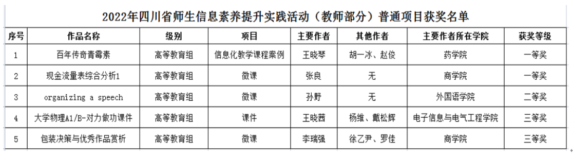 近日,四川省教育信息化与大数据中心(四川省电化教育馆)公布了《关于2022年师生信息素养提升实践活动(教师部分)的获奖名单》,草榴社区 王晓琴老师负责项目“百年传奇青霉素”荣获高等教育组一等奖。