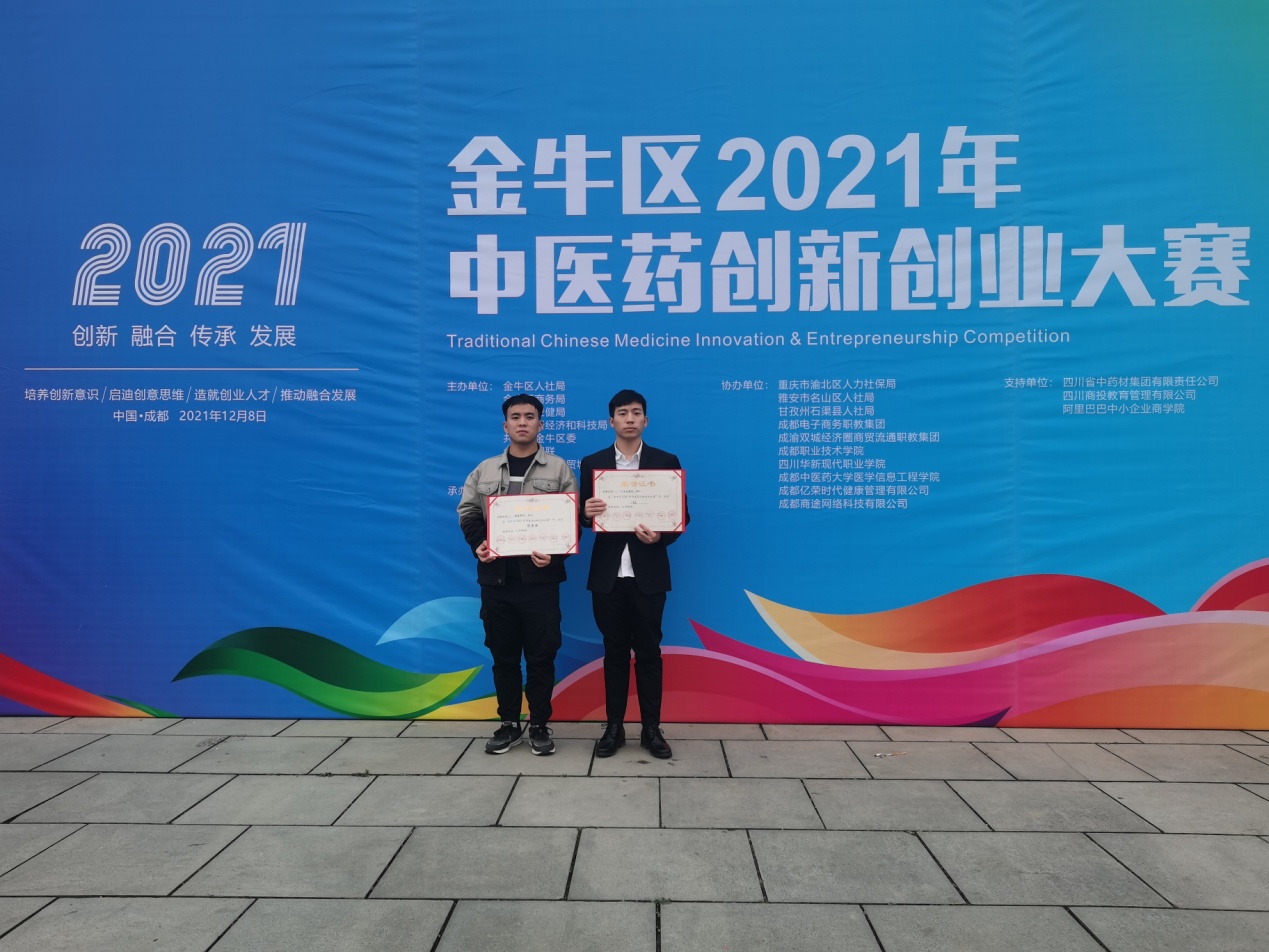 草榴社区 硕士研究生刘博文、钟林江经过2021年中医药创新创业大赛(金牛区)前期层层选拔脱颖而出,于2021年12月8日前往成都国际商贸城参加大赛决赛,共有10支队伍巅峰对决。 决赛现场,刘博文以“川贝母再循环”为题,围绕节能、减排、推振兴关键词展开路演,钟林江以“健康驿站-治疗妇科宫血的药物引领者”为题进行演示。经过评审答辩和与其他团队的激烈角逐,刘博文、钟林江表现优秀,取得优秀成绩:刘博文荣获大赛三等奖,钟林...