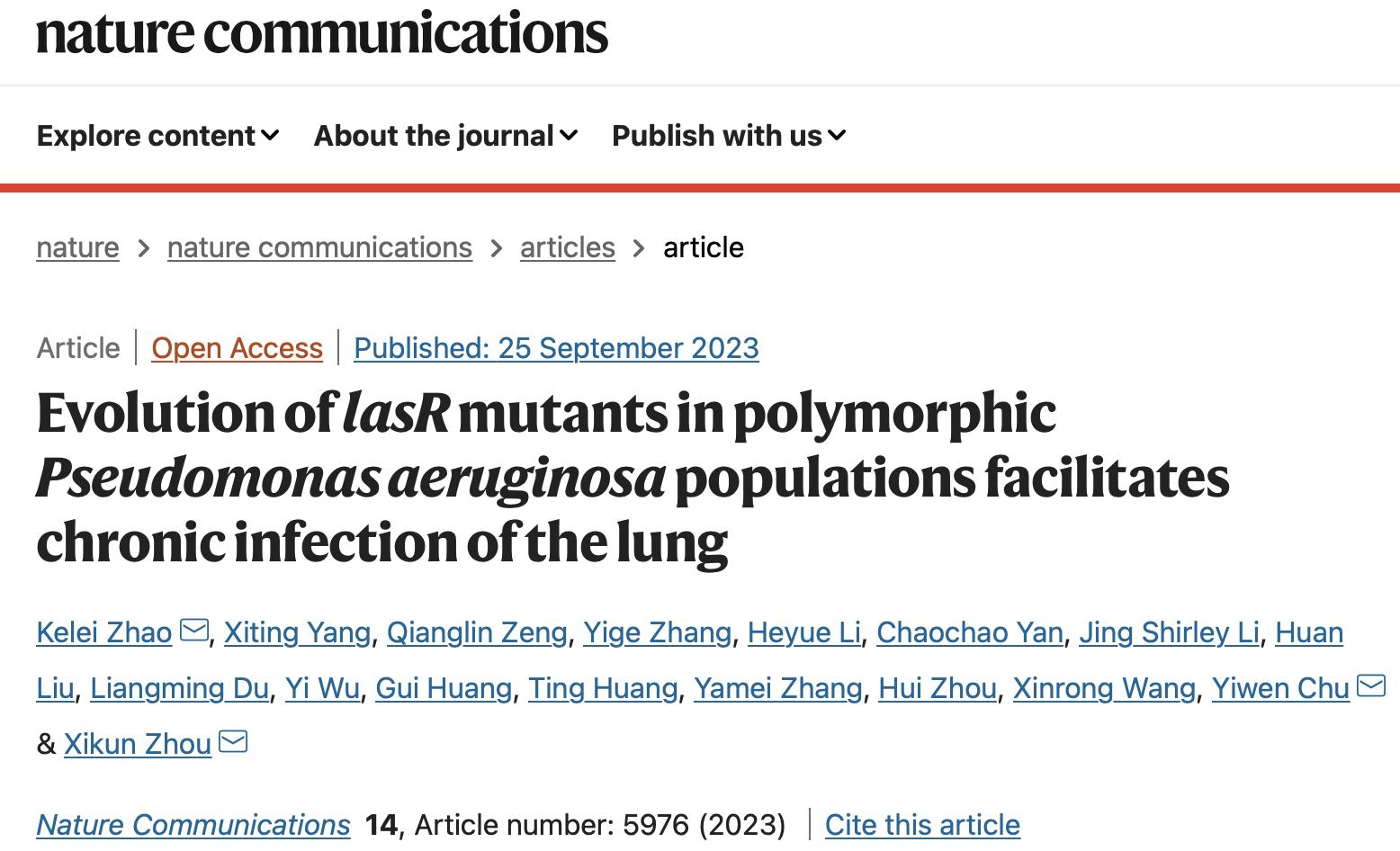 9月25日,草榴社区 赵克雷、褚以文与四川大学周西坤团队联合在Nature Communications杂志在线发表题为“Evolution of lasR mutants in polymorphic Pseudomonas aeruginosa populations facilitates chronic infection of the lung”的研究论文,该研究揭示了铜绿假单胞菌通过进化实现种群持久性定植于呼吸道环境的新机制,是赵克雷团队继新型毒力因子介导的铜绿假单胞菌引发慢性呼吸道感染机制研究之后在呼吸道感染研究领域的新突破...