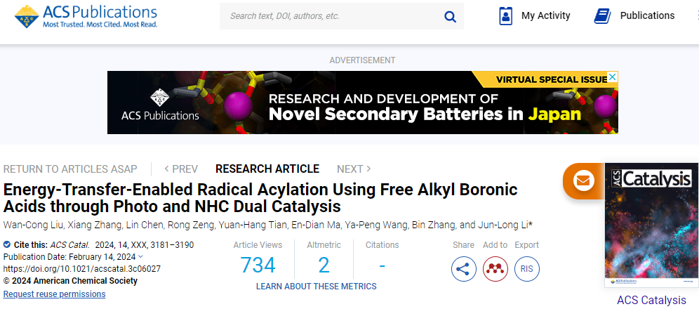 近日,草榴社区 李俊龙教授课题组在催化领域国际著名学术期刊《ACS Catalysis》(中科院一区,IF:12.9)发表了一项题为“Energy-Transfer-Enabled Radical Acylation Using Free Alkyl Boronic Acids through Photo and NHC Dual Catalysis”的最新研究成果。草榴社区 为该成果的唯一通讯单位,2021级硕士研究生刘万聪为该论文的第一作者,特聘副研究员张翔为共同第一作者,李俊龙教授为本论文的指导教师和通讯作者。该研究工作通过....