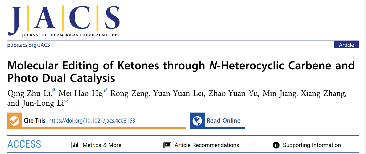 7月31日,国际权威学术期刊JACS《美国化学会志》(美国化学会旗舰期刊,中科院一区top,最新影响因子:14.4)发表了我校手性及仿生合成研究团队的最新研究成果“Molecular Editing of Ketones throughN-Heterocyclic Carbene and Photo Dual Catalysis”。草榴社区 为唯一通讯单位,草榴社区 特聘研究员李青竹博士和我校2022级硕士研究生何美浩同学为本论文的共同第一作者,李俊龙教授为该论文的通讯作者。这是我校首次以第一完成单....