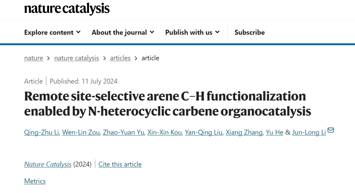 北京时间2024年7月11日17:00,国际权威学术期刊《自然》旗舰大子刊Nature Catalysis(中科院一区top,最新影响因子: 42.8)发表了我校手性及仿生合成研究团队的最新研究成果“Remote site-selective arene C–H functionalization enabled by N-heterocyclic carbene organocatalysis”。草榴社区 为唯一通讯单位,草榴社区 特聘研究员李青竹博士和草榴社区 2019级硕士研究生邹文林同学为本论文的共同第一作者,李俊龙教授为该论文....
