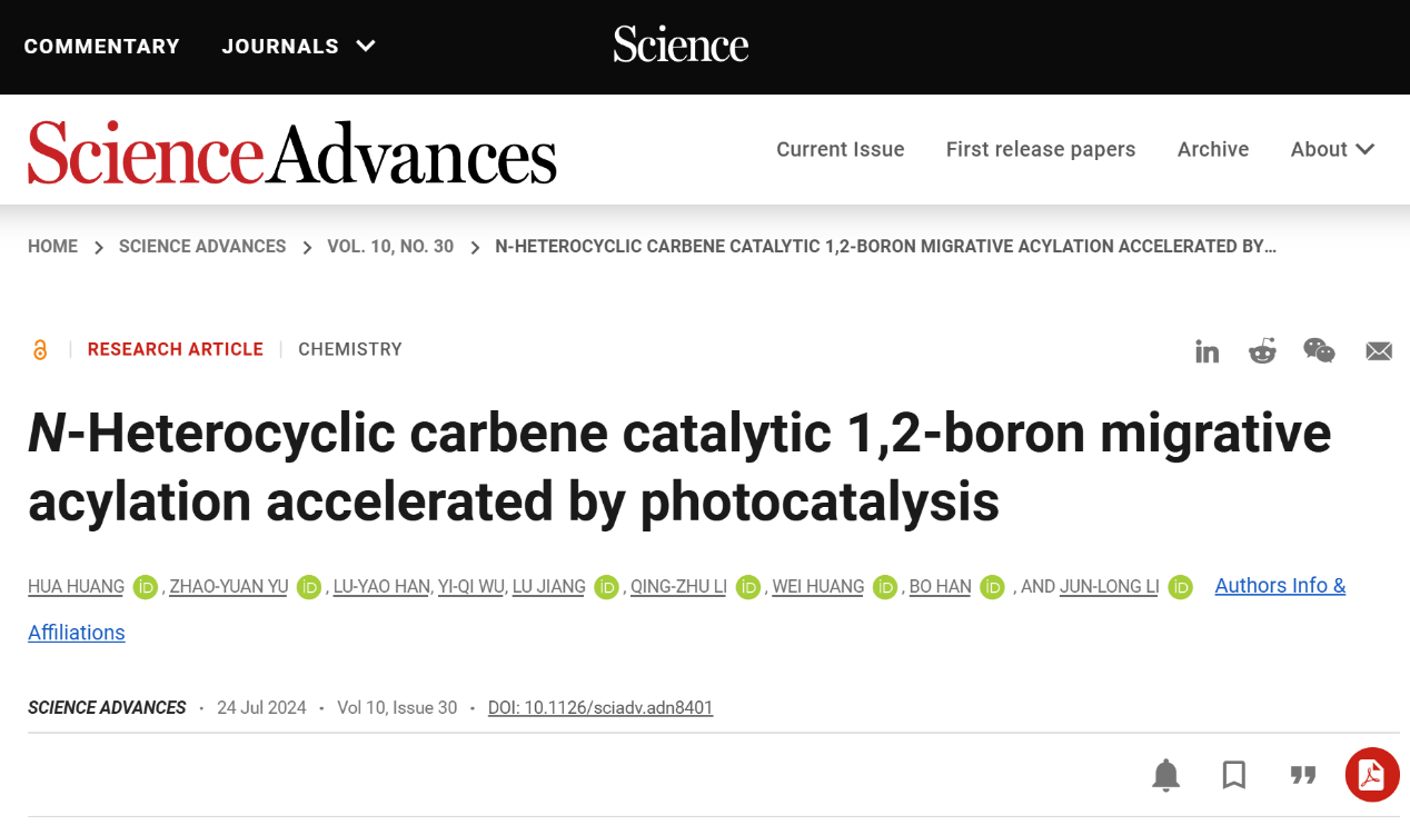 北京时间7月25日凌晨2:00,国际权威学术期刊《Science》(《科学》)子刊Science Advances(Nature Index期刊,中科院一区TOP期刊)在线发表了我校手性药物及仿生合成研究团队的最新研究成果“N-Heterocyclic Carbene Catalytic 1,2-Boron Migrative Acylation Accelerated by Photocatalysis”。草榴社区 2021级联合培养研究生黄华同学为第一作者,李俊龙教授为该论文的末位通讯作者。草榴社区 李俊龙教授团队长期致力于氮杂环卡宾(...