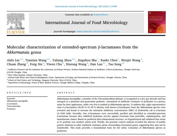 近日,草榴社区 师生在International Journal of Food Microbiology(中科院一区top期刊)发表题为‘Molecular characterization of extended-spectrumβ-lactamases from theAkkermansiagenus’的研究论文,微生物与生化教研室林家富副研究员和草榴社区 2022级研究生王田甜为共同第一作者,宋涛副研究员作为通讯作者,草榴社区 为第一署名和通讯单位。