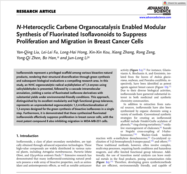 2月13日,草榴社区 手性及仿生合成研究团队在国际Top期刊《Advanced Science》(中科院一区,IF:14.3)上以草榴社区 为第一通讯单位在线发表了题为“N-Heterocyclic Carbene Organocatalysis Enabled Modular Synthesis of Fluorinated Isoflavonoids to Suppress Proliferation and Migration in Breast Cancer Cells”的最新研究成果。草榴社区 与成都中医药大学联合培养博士研究生刘燕青为本论文的第一作者,李俊龙教授为...