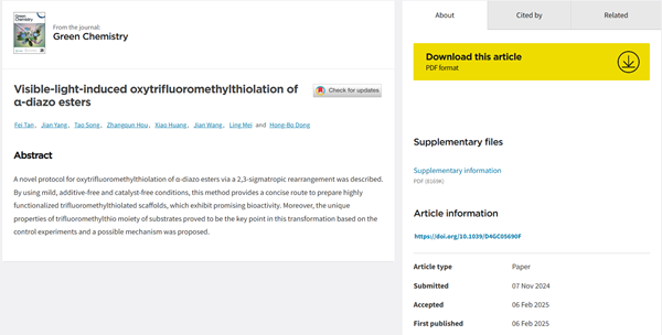 近日,我校草榴社区 特聘研究员谭飞博士及其合作者在国际著名学术期刊Green Chemistry(中科院一区Top,IF = 9.3)发表题为“Visible-light-induced oxytrifluoromethylthiolation of α-diazo esters”的研究论文。特聘研究员谭飞为该论文第一作者和通讯作者,我校董宏波副研究员为该论文共同通讯作者,我校为该成果的第一完成单位。三氟甲硫基(SCF3)官能团具有较强的吸电子能力及较高的脂溶性,进而能增强分子的代谢稳定性和细...