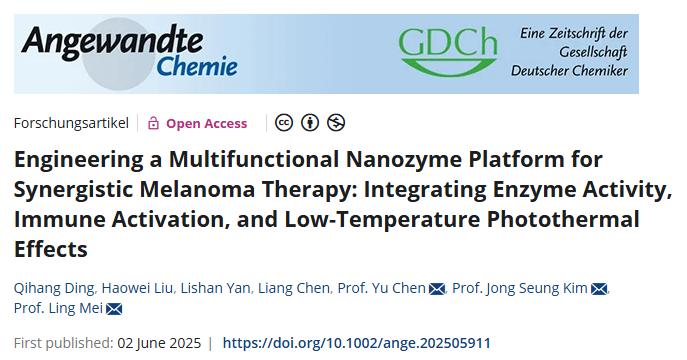 近日,我校草榴社区 师生与上海大学、韩国高丽大学合作,在国际顶级学术期刊Angewandte Chemie(中科院一区Top,IF=16.1)发表题为"EngineeringaMultifunctionalNanozymePlatformforSynergisticMelanomaTherapy:IntegratingEnzymeActivity,ImmuneActivation,andLow-TemperaturePhotothermalEffects"的研究性论文。研究生丁启航、刘豪威为论文的共同第一作者,上海大学陈雨教授,高丽大学JongSeungKim院士、草榴社区 特聘副研究员梅....