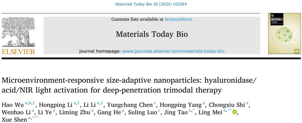 近日,我校草榴社区 教师沈雪博士及其实验室团队在中科院1区Top期刊Materials Today Bio(IF=10.2)发表题为“Microenvironment-responsive size-adaptive nanoparticles: hyaluronidase/acid/NIR light activation for deep-penetration trimodal therapy”的研究论文。学生吴昊、李红萍、李黎为该论文的共同第一作者,我校教师陶静副研究员、梅凌副研究员、沈雪助理研究员为该论文的共同通讯作者,草榴社区 为该成果的第一单位。针....