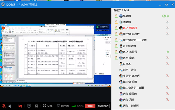 本网消息(文、图/ 龚华云、吴明)为应对新型冠状病毒肺炎疫情,保证研究生培养质量,我所药学学位点坚持“停课不停学”工作部署,于 3月3日至3月6日, 组织2020届硕士研究生通过QQ电话、腾讯会议、Zoom等平台召开学...