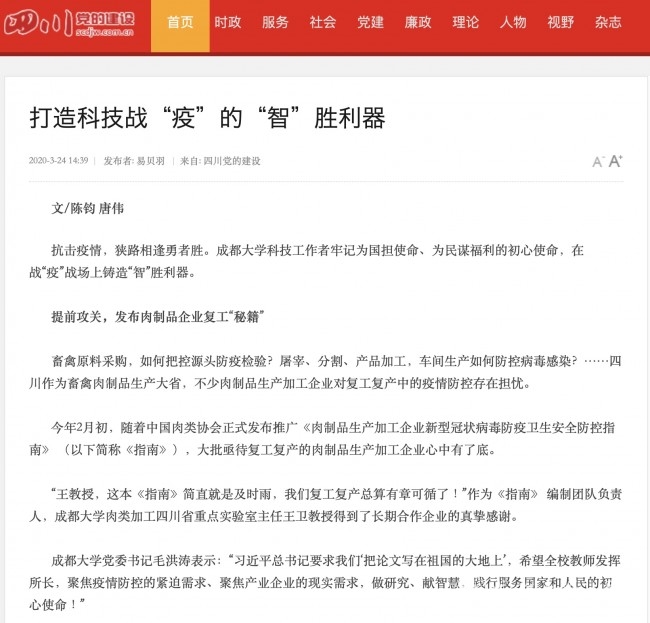 3月24日省委机关刊《四川党的建设》刊发我校关于科技战“疫”专题文章,文中提到我校肉类加工四川省重点实验室编制的《肉制品生产加工企业新型冠状病毒防疫卫生安全防控指南》 、《中国抗生素杂志》主编刘昌孝发表专...